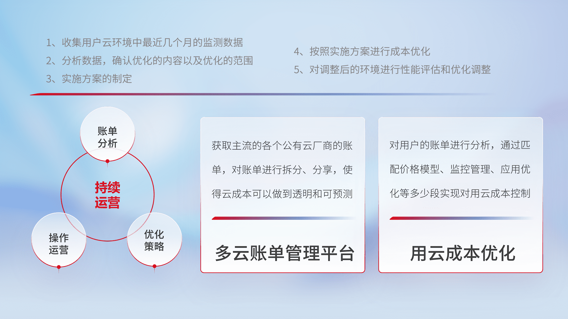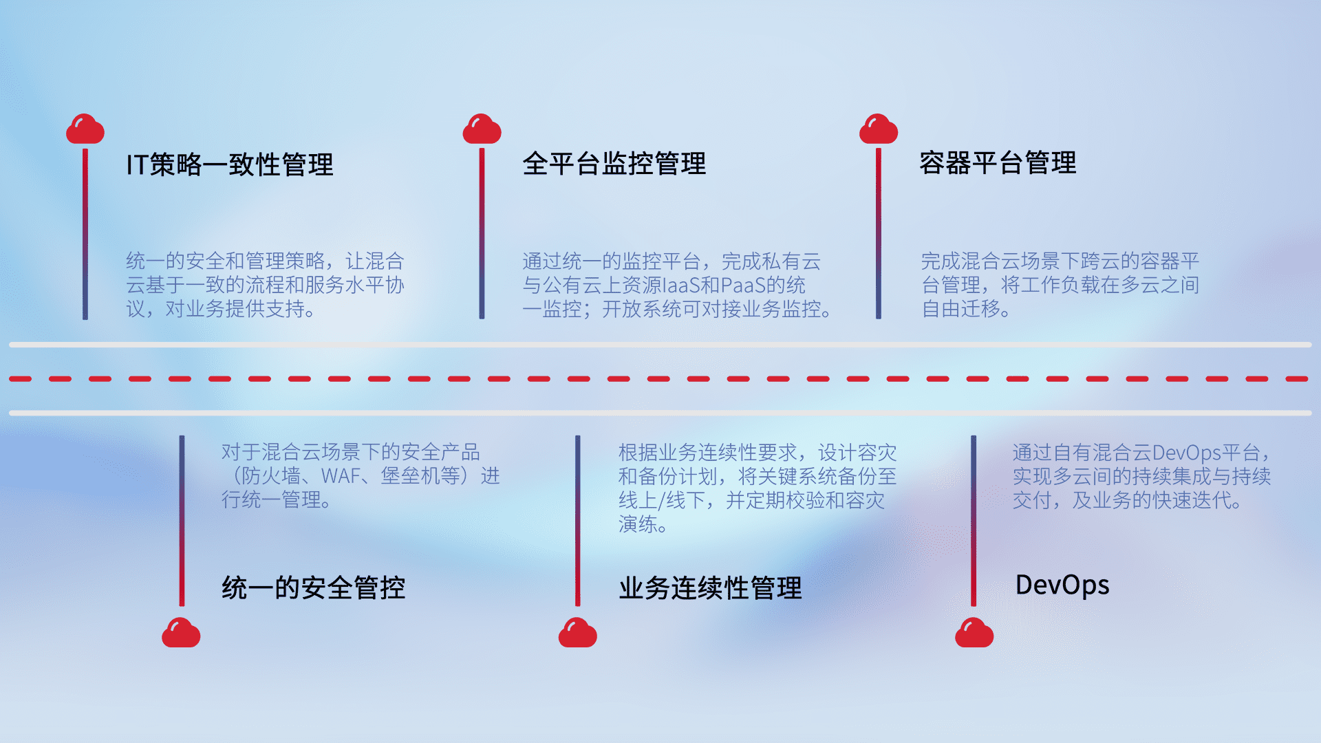 通过多云纳管,,以统一的资源数据模型把客户的云资源进行抽象和封装,,,进而实现对多云资源的统一操作,,,,保障云资源管理的可靠性、、稳定性与可用性。。。。量身定制化运维内容,,,,配置、、、开发运维、、、补丁管理、、、备份、、、监控、、认证和访问管理、、、、审计和日常巡检等,,,保障在用云过程中的可靠度,,,稳定度以及高可用率。。。