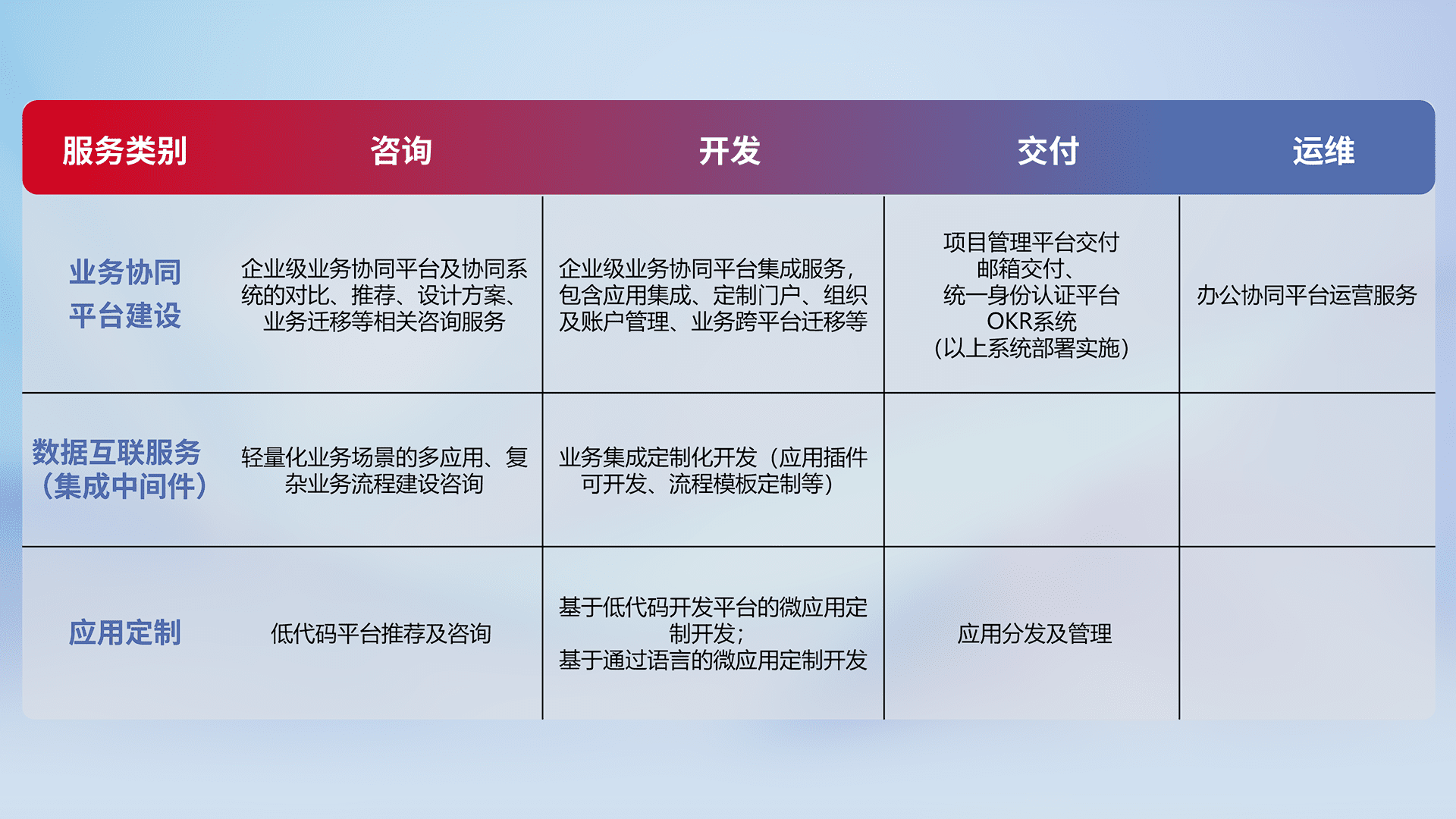 针对钉钉、、、、企微、、、IDaas等平台级产品提供产品的规划、、方案、、、、交付、、、定制化开发等服务,,实现如统一协同办公、、智能客户服务、、、、混合会议管理、、智能数据查询、、等业务场景,,实现数字化转型。。